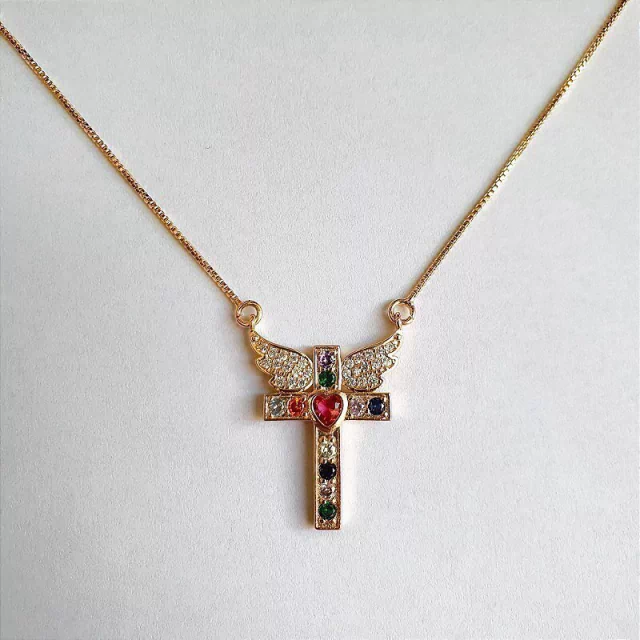 Colar com pingente de cruz cravejada em zircônias coloridas.