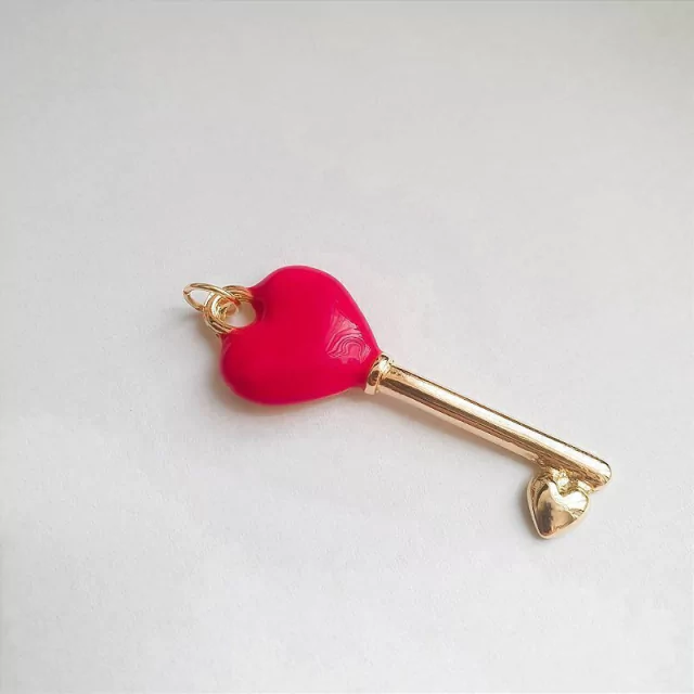 Pingente chave com coração esmaltado em rosa pink.
